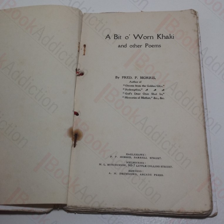 [1917] 52pp, with two full page illustrations. In stiff card covers, bound with red ribbon. Covers worn and chipped all round, with dog-eared corners, and top half of backstrip cracked with minor loss, ribbon frayed, faded and fragile. Gift inscription, dated 1920, on first leaf, pages slightly discoloured with age, some wear at extreme edges, and a little, occasional spotting. Fred Pitman Morris was an Australian hymn-writer, songster and poet (and sometime special magistrate of the Children’s Court, Melbourne). A Bit o’ Worn Khaki was his third, and perhaps best known, collection of poetry to be published. Hard to find title. 8vo.