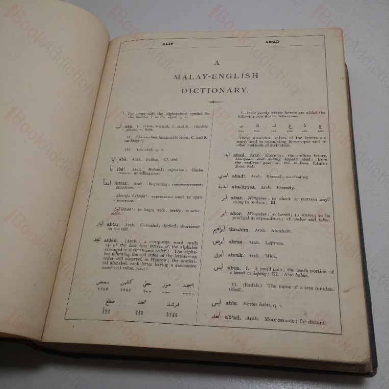 Richard James Wilkinson (1867-1941) was a British colonial administrator, a linguist and a scholarly historian of Malay, serving with the Straits Settlements Civil Service in Singapore at the time he compiled this monumental work on the Malay language. Once considered the standard work on the Malay language, although in part overtaken by Rumi (using the Latin alphabet), it remains the standard work on Jawi script, now widely used for religious and cultural purposes. Includes among the appendices in part three brief essays and entries on Malay History and Literature, The Malay Alphabet, Pronunciation, Malay Dialects etc. An important and now scarce work.
