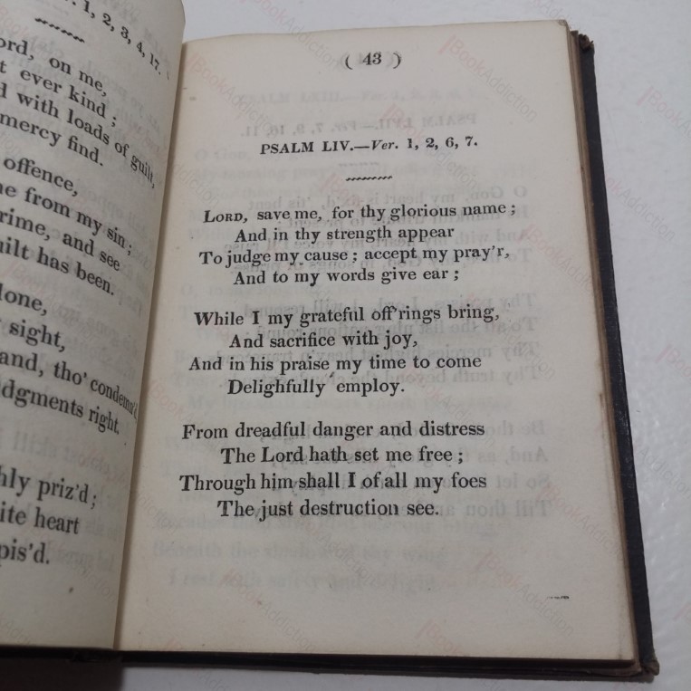 122pp. Marbled endpapers. Bound in full black leather with gilt decorations and lettering (boards are worn, rubbed at edges, chipped at spine ends). Internally neat, clean and bright, with some faint spotting on prelims only. The final page is oversized – it appears to be a printing fault – and the edges have been neatly folded in, in an unusual manner. Firmly bound. Various editions of ‘selections from the new versions of the psalms [of David] were published in the early to mid 19th century, often selected for use in specific parishes or groups of churches. This edition includes a generous selection of psalms and verses from psalms designed and published for use at St Mary, Newington (on Kennington Park Road, just near Kennington Tube Station). Although once popular, such psalms books would have been distributed to parishioners (this one was sold by the parish Sextons from the vestry room) and likely heavily used, and are now very hard to find.