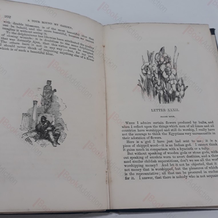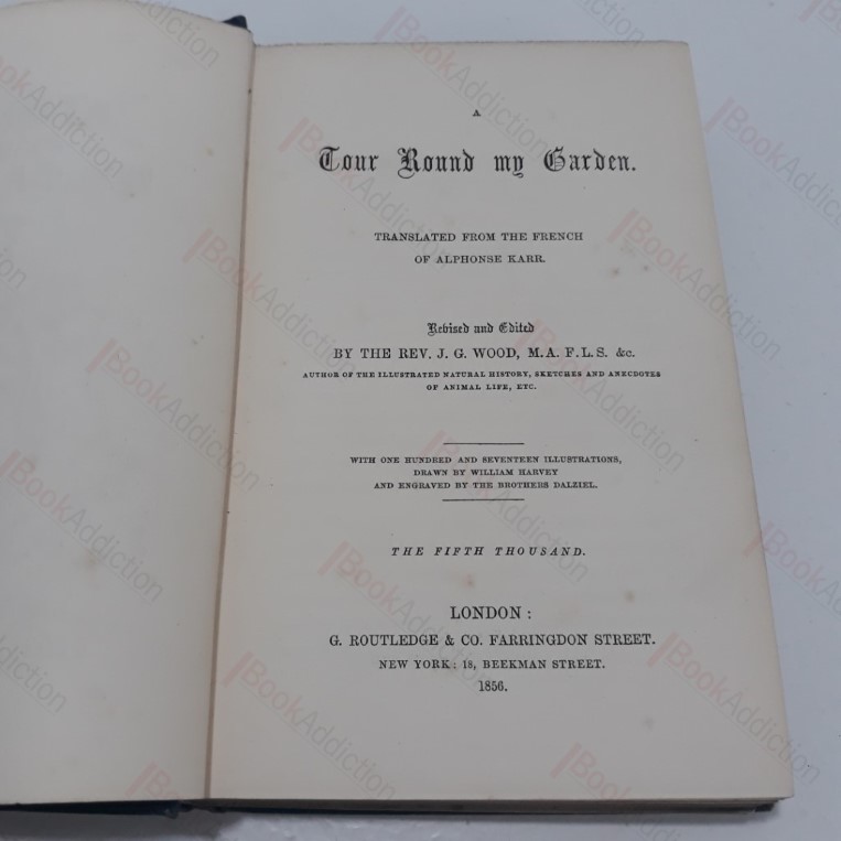 Fifth printing. Translated from the original French of Alphonse Karr. xii, 332pp plus 8pp of advertisements. 117 illustrations drawn by William Harvey and engraved by the Brothers Dalziel. Navy cloth-covered boards with blind embossed and gilt design and text on spine and covers. Mild rubbing of the spine ends. Front corners turned in. Slightly shaken, gutter torn half way at front end papers and stretched mid way through, otherwise internally neat and clean. Alphonse Karr (1808-1890) was a French novelist, brilliant journalist and critic. ‘Voyage Autour de Man Jardin’ was published in 1845, this generously illustrated translation is set out in 59 letters. 12mo.