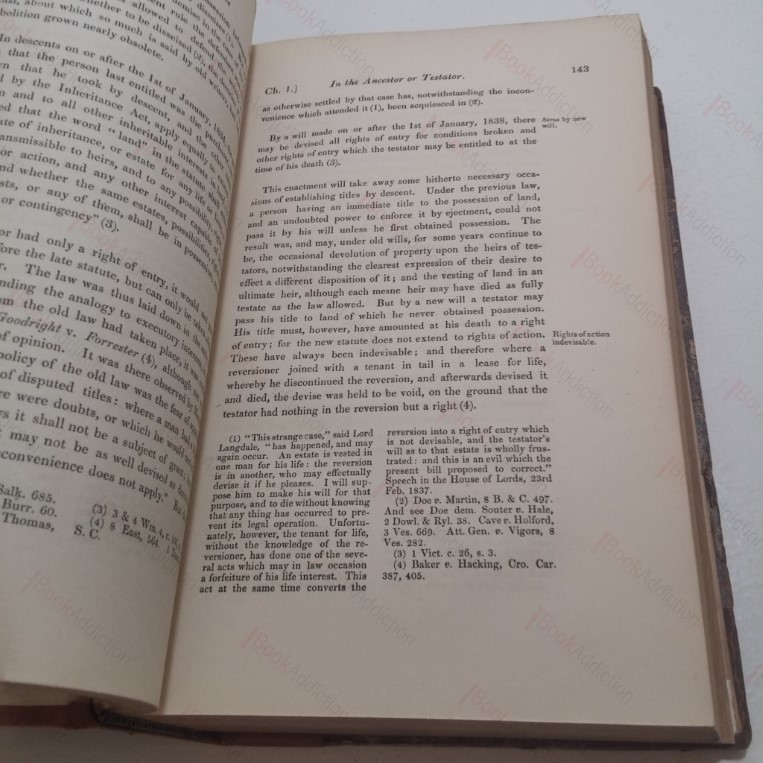 First edition. xxviii, 832pp, including table of cases. Quarter bound in tan calf’s leather over marbled paper boards, with red spine label and gilt titles. Boards are strong and square, rubbed at edges, right through on rounded corners, worn, chipped in places, red spine label chipped). Previous owner’s name on flyleaf, hinges cracked, else internally neat, clean and tidy. Firmly bound. Hubback’s work on succession to and inheritance of real and personal property and peerages, a door-stopping legal treatise used as the standard reference work on the topic well into the early years of the 20th century. Incidentally, Hubback married Catherine Austen, niece of Jane Austen. A very good, first edition, copy.