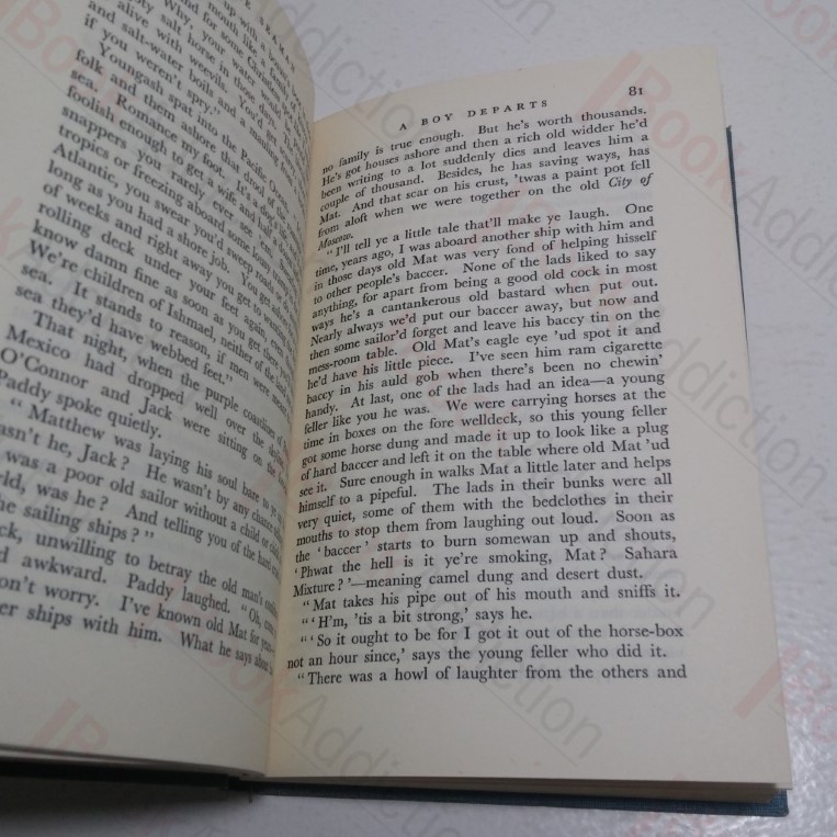 316pp. Cyan cloth-covered boards, silver titles on spine. Bumped spine ends. Cocked. Internally neat, clean, bright and tight. Dust jacket has several closed tears, shelf wear, chipping to edges, mirrors book damage, price unclipped. 12mo. Unable to face the bleak prospect of life in long shore fishing, Jack Vallon breaks with the age-long tradition of his family and joins first the Royal Navy and then the Merchant Service.