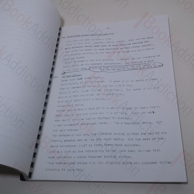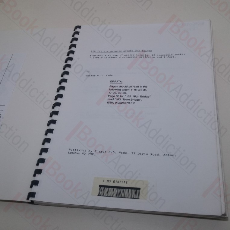 Stated to be one of a limited first edition of 200 copies. 86pp, with some black and white figures and illustrations in text. Photocopy of a typed manuscript, printed single sided, spiral bound with clear plastic front cover. Tall 4to. Ex reference library with usual markings. Covers soiled and rubbed at edges. Page edges a little rubbed, especially around lower leading corner, where is evidence of inert water damage. A personal study of all the Thames crossings, gathering evidence from visits and crossings, and concentrating on the history and nature of those bridges etc which are not well recorded or chronicled elsewhere. Hard to find report.