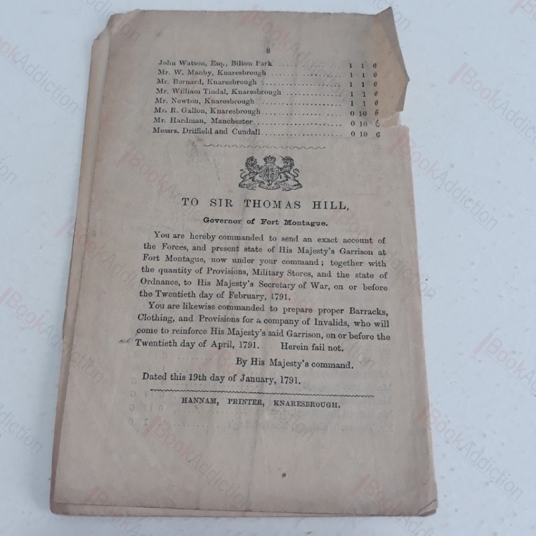 Undated leaflet, c. 1870 8pp leaflet. Cover page has engraved vignette. Pages a little toned, especially the front cover, two corners creased, short tear on last leaf. Provides an account and description of Fort Montague, otherwise known as the house in the rock, and a charge delivered to Sir Thomas Hill appointing him as Governor of Fort Montague in 1791. There is some suggestion that this pamphlet was authored by Babara Hofland, but that is uncertain. See Butts, Mistress of our Tears, p.99. Slim 16mo. ESTC notes three variants of this pamphlet but does not note this one.