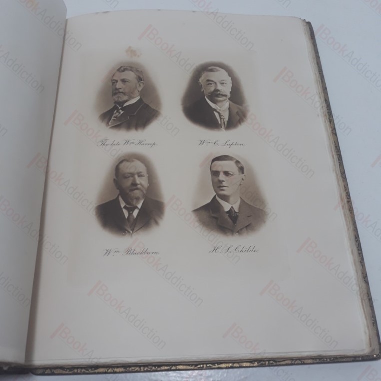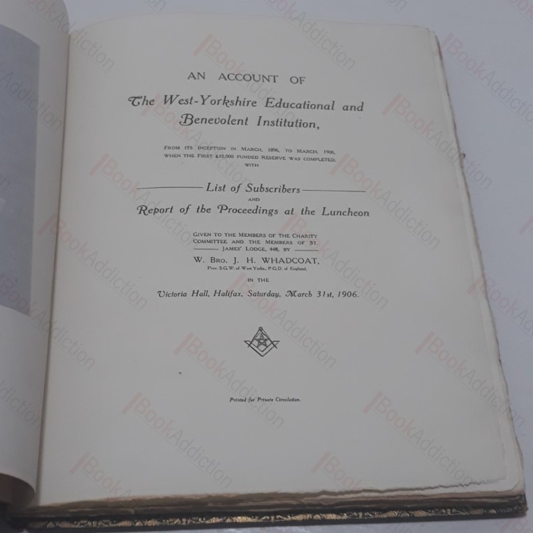 Full title: An Account of the West Yorkshire Educational and Benevolent Institution from its Inception in March 1896 when the first �10,000 funded reserve was completed, with a List of Subscribers and Report on the Proceedings at the Luncheon Given to Members of the Charity Committee and Members of St James Lodge, 448, by W Bro. J H Whadcoat in the Victoria Hall, Halifax, Saturday March 31 1906. First, likely only, edition, privately printed for private circulation. Bound in full blue leather with gilt lettering and decoration (boards rubbed at edges, lightly cracked along spine joints, marked and faded on spine). Top edge gilt, all other deckled. Inner gilt dentelles, marbled endpapers. 110pp plus 24 tissue-guarded plate portraits. (Internally some mild, scattered spotting, page edges soiled else neat, clean, bright and tight.) An account of the founding and first ten years of operation of the masonic West Yorkshire Educational and Benevolent Institutional. Inscribed by the author, indicating its presentation to W Brother John C Malcolm. Large 4to. .