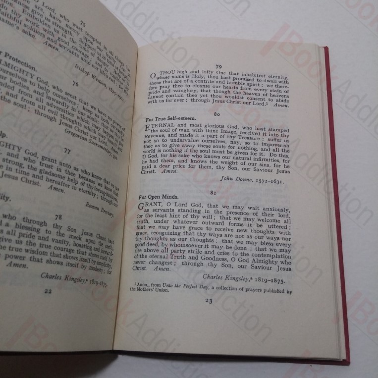 118pp. Red cloth-covered boards, black titles on spine. Endpapers tanning. Previous owner’s name on front free endpaper. Internally neat, clean, bright and tight. Dust jacket has <1cm closed tear top front corner, light shelf wear, chipping to edges, price clipped. 16mo. Prayers compiled for use at home and in school.