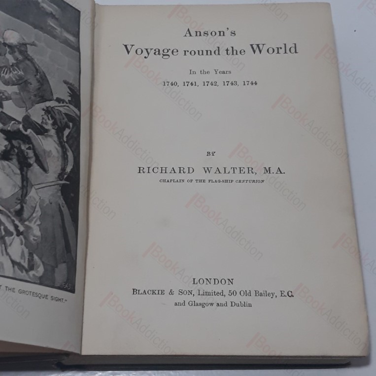 Undated, 220pp , 20pp Blackie book catalogue. Black and white plate frontispiece. Olive green cloth-covered boards with 2 colour and gilt decoration and lettering on spine and front, designed by Talwin Morris. Slight bumping to head and heel of spine. Bottom front corner turned in, slightly cocked. Missing front free end paper, rear end papers browned. Initial pages browned. Names on verso of frontispiece covered over. Follows the life of Lord Anson and his ascent through the navy including his knowledge due to the circumnavigation of the globe. 12mo.