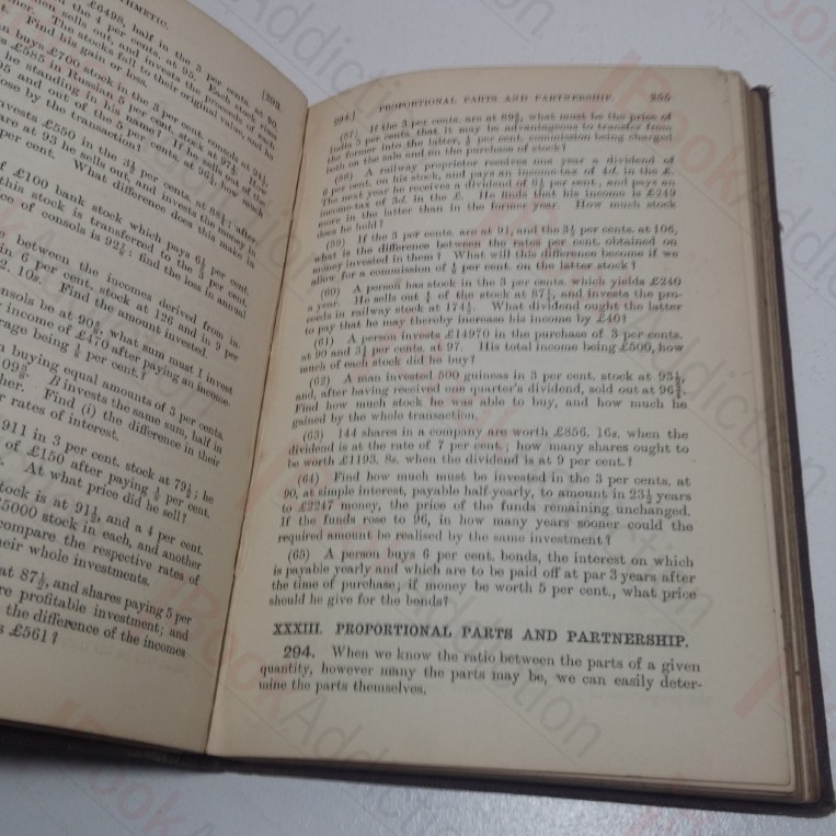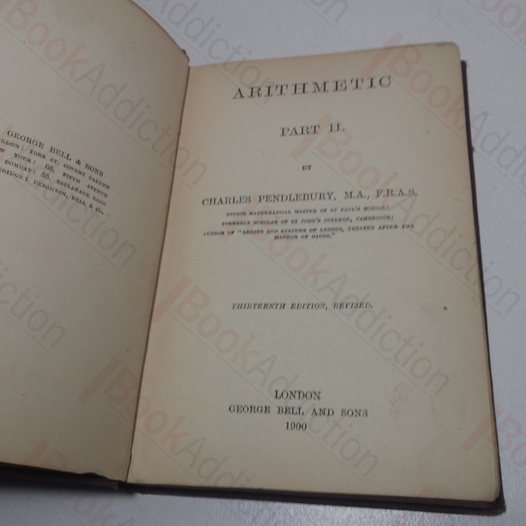 185-396pp, xx answers, 48pp publisher’s catalogue. Brown cloth-covered boards; blind-embossed design on front, gilt titles on spine. 12mo. Sun-faded spine, rubbed extremities. Text block edges tanning. Endpapers tanning; previous owner’s name (crossed out) on front pastedown; equation on front free endpaper, volume very loose. Otherwise, internally neat and clean.
