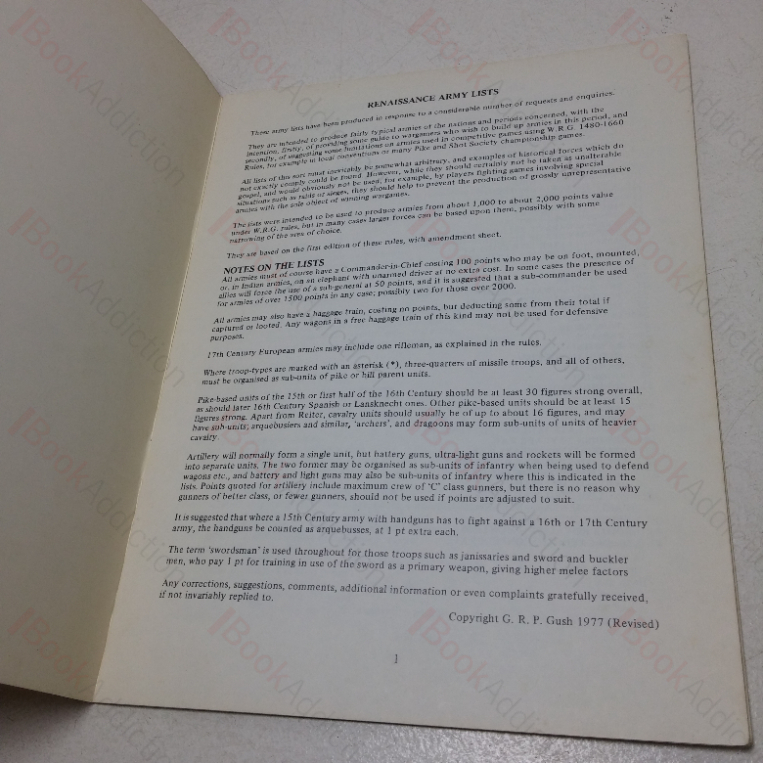 This copy comes from the collection of the late George R P Gush – the compiler of this publication. Gush was head of history at West Kent College but is perhaps better remembered as a key contributor to the development of early wargaming, and as an active wargamer especially in Renaissance wargames. His Renaissance Armies (1975) has become a classic work on the topic. He founded the Tunbridge Wells Wargames Society in the late 1960s, remaining its chairman until 2007. A regular contributor to various wargaming and modelling magazines, he authored with Andrew Finch A Guide to Wargaming (1980) and the well-regarded Wargames Rules for Fifteenth to Seventeenth Centuries.