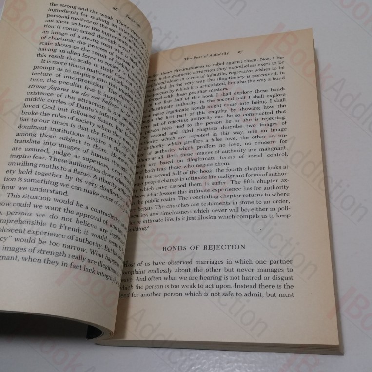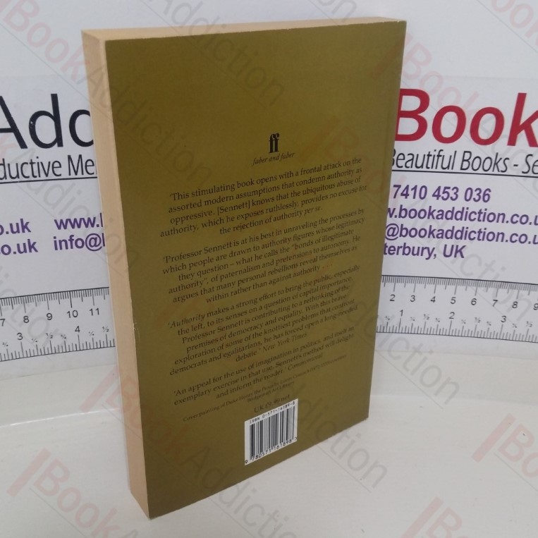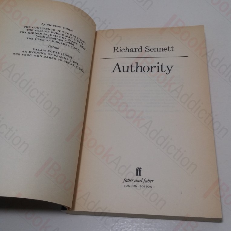 xiv, 206pp. Pictorial light card covered boards. 8vo. Text block edges tanned; affects page margins. Internally clean, neat and tight. Looks at the role of authority in modern life and is divided into sections on Negation – the Fear of Authority, Paternalism, and Autonomy. Recognition – The Unhappy Consciousness, Visible, Legible Authority, and Authority and Illusion.