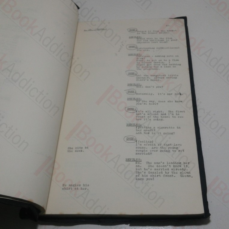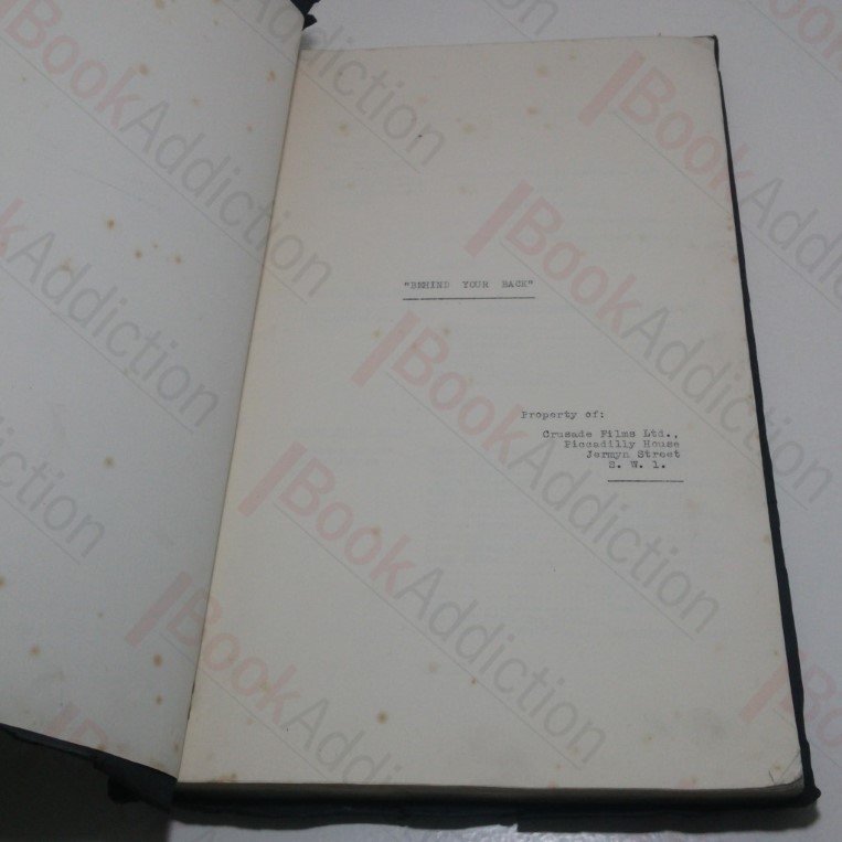 Unpaginated, undated. Black heavy paper covers, sewn. Chipping and folds to edges and wear to covers. Internally, neat, clean, bright and tight. Folio. The film screen script for Behind Your Back – the part of Gwen has been circled throughout and the name Elizabeth Astell – who played Gwen in the film is both on the front cover and first page.