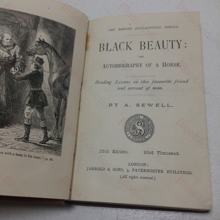 Jarrold & Son published the first edition of Anna’s Sewell’s pioneering animal rights novel in 1877. It was an instant best-seller and was reprinted many times. This undated but pleasingly early reprint dates from around 1880, published as part of Jarrold’s Empire Education series, described on the title page as ‘reading lessons on this favourite friend and servant of man’. RSPCA promotional notes of the last leaf of the novel.