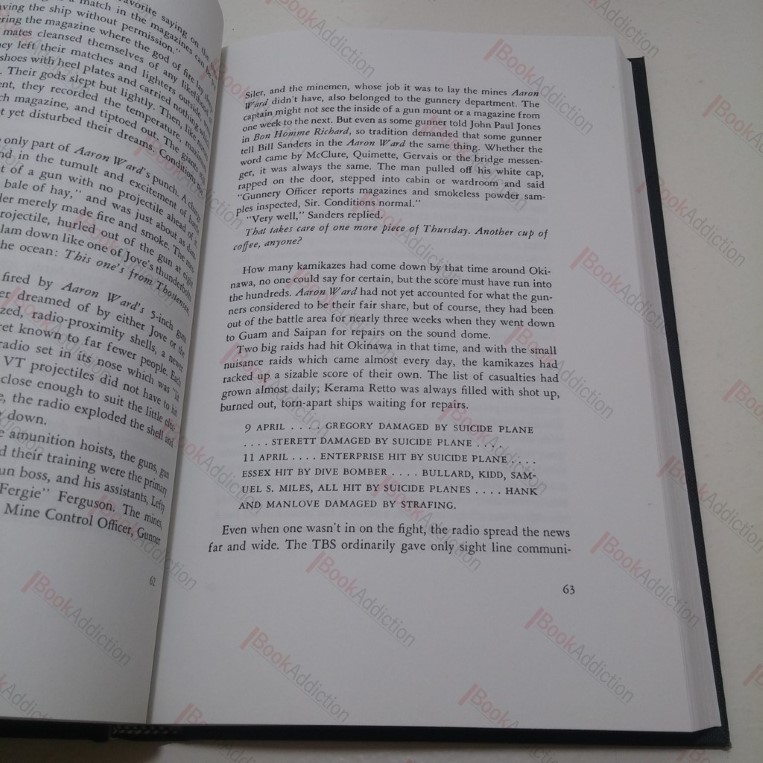 272pp. Black cloth-covered boards, silver titles on spine. Very slightly bumped spine heel. Internally neat, clean, bright and tight. Dust jacket has some shelf wear, price unclipped. 8vo. Depicts the heroism of U.S. naval forces in the Pacific during World War II by telling the story of the USS Aaron Ward, a destroyer-turned-minelayer on the radar picket lines of Okinawa.