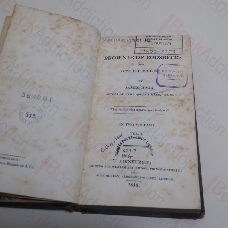Volume one (of two) only. xii, 296pp. Half leather over brown cloth, gilt titles on spine. Tartan endpapers. Upper text block edge gilded, other edges speckled. 12mo. Boards heavily worn, rubbed at edges and spine tips, shelf worn with chips in cloth and leather, two labels taped over spine, a few small white spots. A few minor indentations on text block edges. Ex library markings on endpapers, with clumsy removal of, presumably a lending sheet leaving scar long gutter. Previous owner’s name on half title. Various library stamps and lettering on title page and following two pages. A little spotting and toning on first and last few leaves, else internally neat and bright. Brownie of Bodsbeck was the first, short, novel by James Hogg. Set in the Scottish Borders in 1685, it portrays the persecuted Covenanters, and a harsher view of the Royalists; and draws extensively on local superstitions and folklore. First published in 1818 by William Blackwood in Edinburgh and John Murray in London.