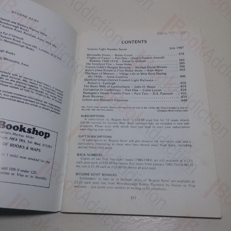 pp 377-440, black and white illustrations throughout. Stapled booklet in glossy card covers (covers a little rubbed and faded with minor corner creasing, scuffed around spine). Internally neat, clean, bright and tight. Bygone Kent is a journal issued monthly featuring articles and research relating to Kent’s local history. Articles in this volume include the topics: Whitstable Divers, Flights of Fancy – Kent’s Pioneer Aircraft Builders 1908-1914, The Snodland Fire, Francis Cobb’s Margate Brewery, Kent and Britain’s First Motor Show, The Water Mills of Lamberhurst, Corruption in Canterbury, Ramsgate’s Steam Trawler Fleet, etc. We have many issues of Bygone Kent in stock, with significant discounts available to those ordering more than one issue at a time. Please inquire.