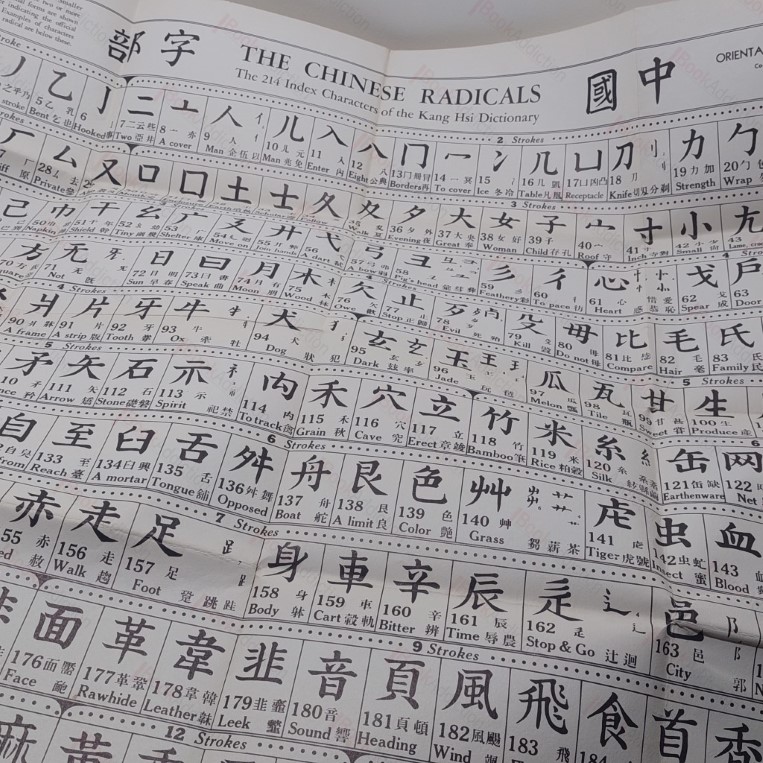 2nd edition (reprint). xvi, 230pp, with six plates and 155 in text illustrations, this copy complete with large fold out chart of the 214 index characters of the Kang His dictionary, with larger characters hand-drawn. The chart is often absent from copies of this book. In beige cloth boards (a little soiled, rubbed at edges, and rounded at corners and spine tips). Endpapers a little scuffed and marked. Slightly shaken. Internally neat, clean, bright and tight. Small 4t0.