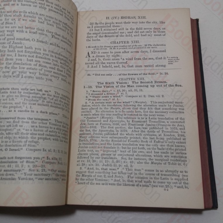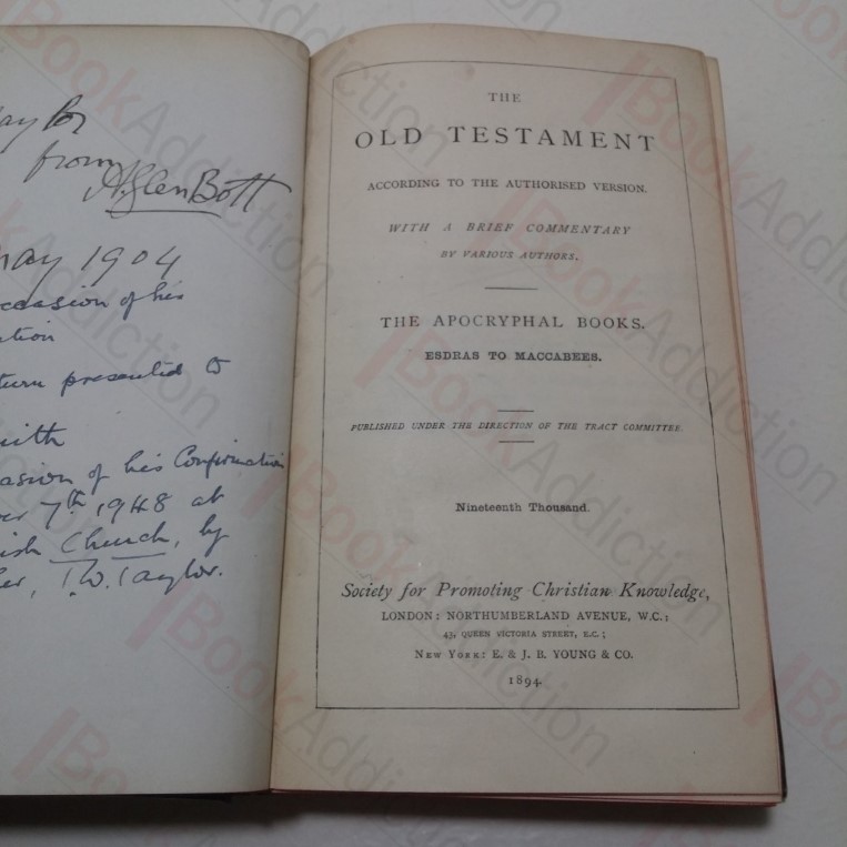 Unpaginated. Black cloth-covered boards, gilt titles on spine; bevelled. Bumped spine ends. Cloth wearing at spine ends and corners. Red sprayed text block edges. Black endpapers. Gift inscriptions to verso of front free endpaper: firstly fated 1904 then handed down by the recipient to his Godson 44 years later on the occasion of his confirmation. Internally neat, clean, bright and tight. No dust jacket. 8vo. With a Brief Commentary By Various Authors. The Apocryphal Books Esdras to Maccabees. Published under the direction of The Religious Tract Society.