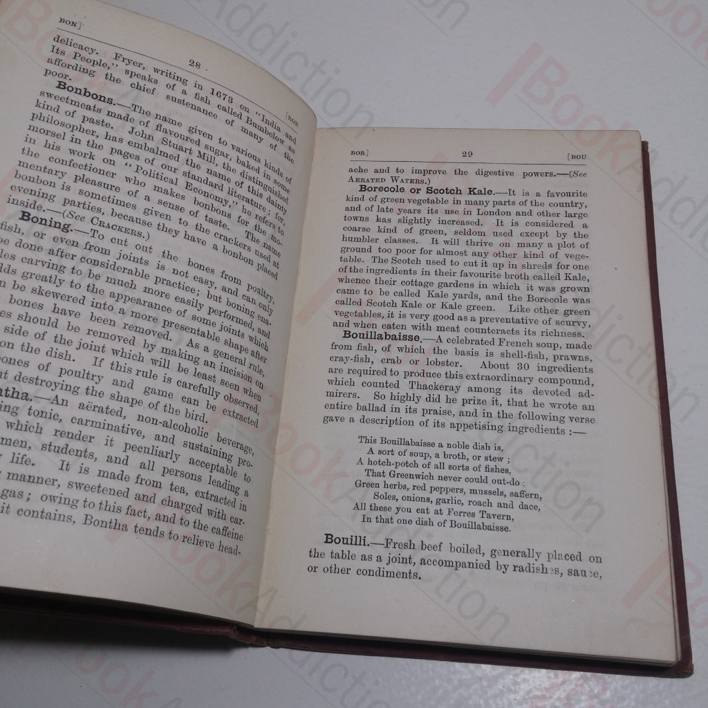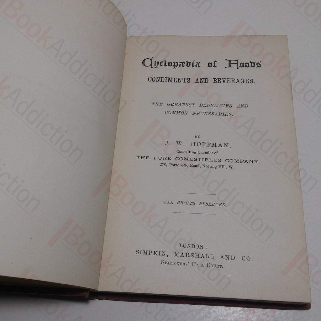 Undated (circa 1880s). 16pp publisher’s ads, xiv, 306pp. Brown cloth-covered boards, black design and gilt titles on front spine. Bumped spine ends, cloth wearing through at ends and edges of cover. Lightly bumped corners and edges, cloth rubber. Text block edges dusty, tanning and starting to fox. Small ink stain on top text block edge. Cocked. Endpapers tanning and foxing. Front gutter cracked. Internally neat, clean, bright and tight. 12mo. Brown cloth decorated boards. A dictionary of food by the consulting chemist of The Pure Comestibles Company. Intended to be of some practical value and interest to ladies superintending their housekeeping, superior hotel-keepers, or their managers, and to all who concern themselves with the delicacies and necessaries that find their way to the table.
