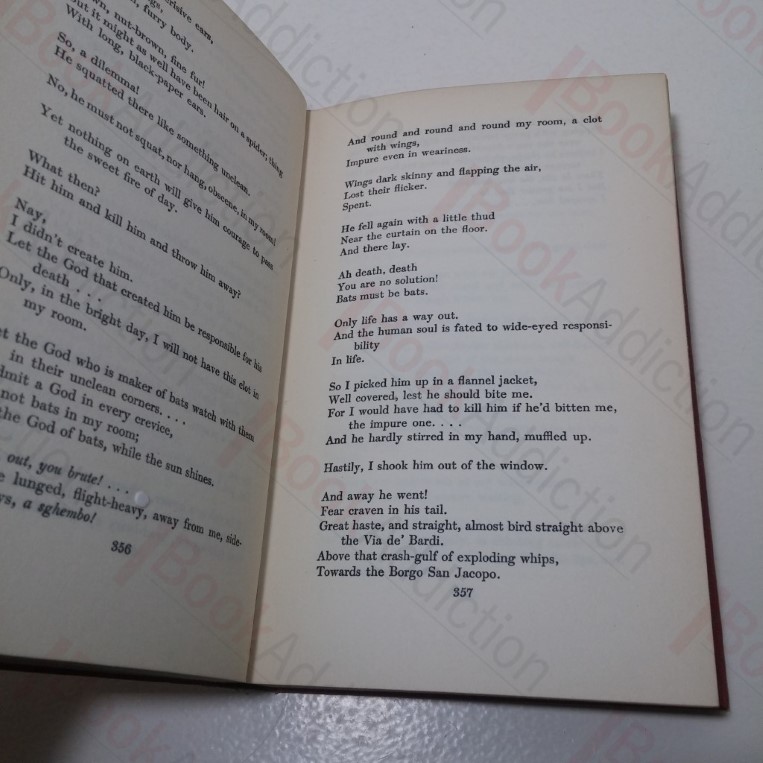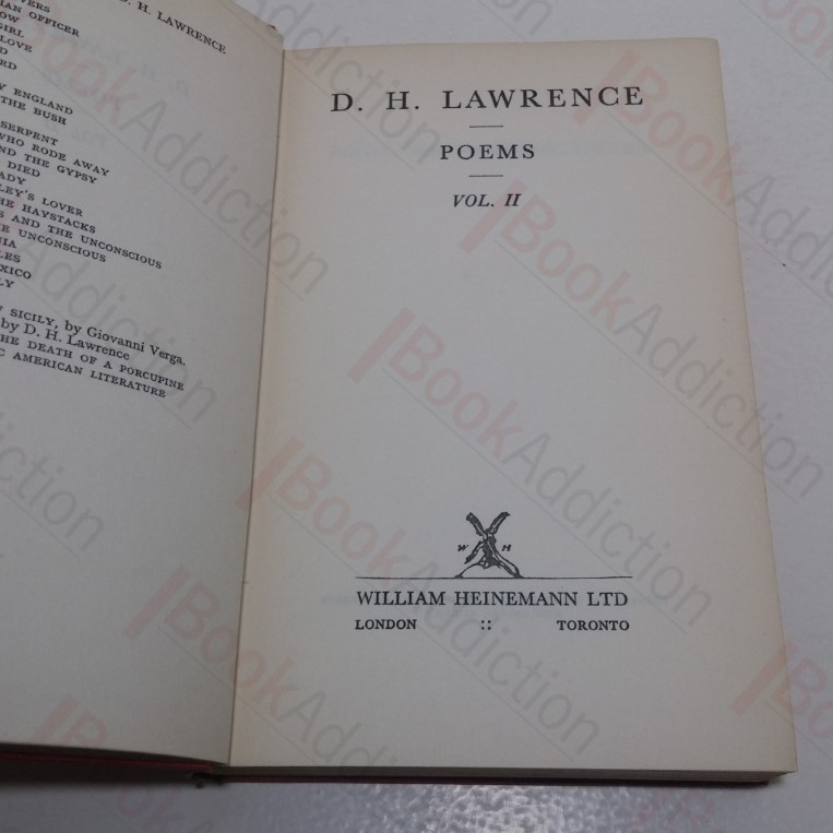 498pp. Red boards with gilt titles on spine. 12mo. Fading to spine and around edges of boards, corners lightly rounded, spine ends rubbed (cloth fraying). Some staining especially to rear board. Previous owner’s details on front free endpaper but otherwise internally neat, clean, bright and tight. Collection of poems by D H Lawrence.