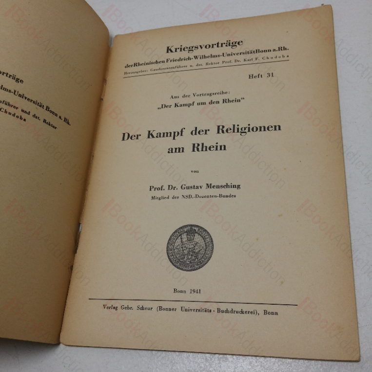 Der Kampf der Religionen am Rhein (Aus der Vortragsreihe Der Kampf um den Rhein, Kriegsvorträge der Rheinischen Friedrich-Wilhelms-Universität Bonna. Rh., Heft 31) [The Clash of Religions on the Rhine, from the Lecture Series The Struggle for the Rhine, War Lectures of the University of Bonn, Booklet 31)