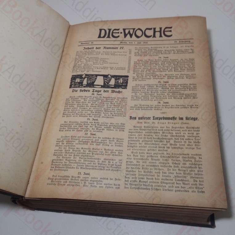 Text in German. 26 issues of Die Woche published during the latter part of 1916, bound together into a single volume. Copiously illustrated. Quarter bound in linen over speckled paper-covered boards. Tall 4to. Boards rubbed all rounded edges, worn with some mild scratches on flat surfaces, spine cloth gently pushed at ends. Pages are a little browned in margins and a little brittle. Die Woche was a German mass-produced, illustrated weekly news and commentary magazine with a strong focus on images and picture of the day. The issues offered here, from the latter part of 1916 carry much news and reporting of the first world war.