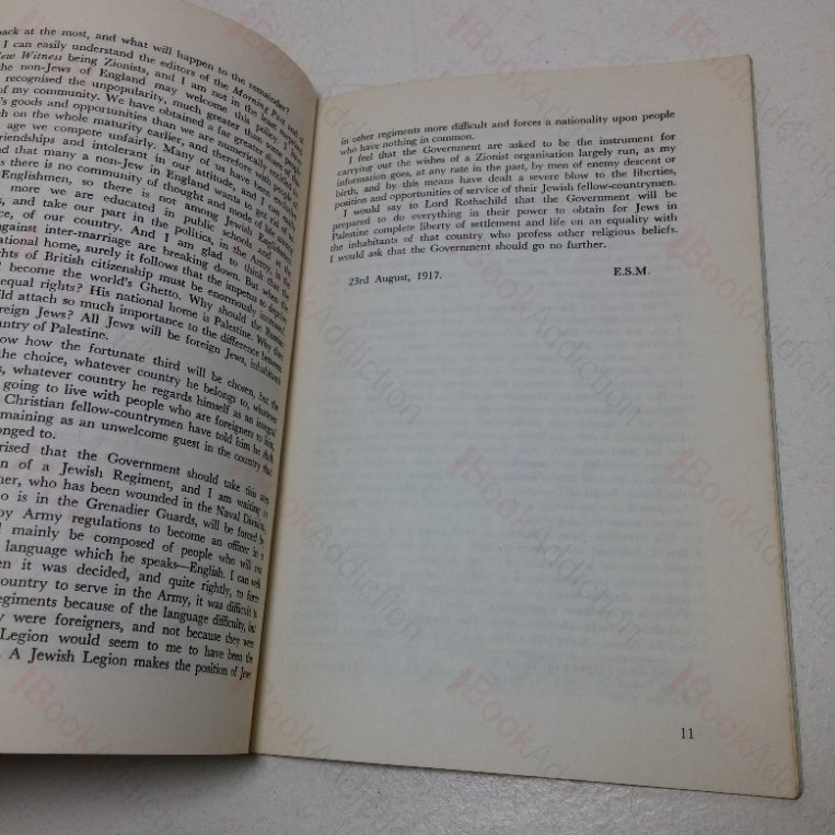 Reproductions of three memoranda secretly circulated within the British Government by the then Secretary of State for India regarding his opposition to the 1917 Balfour Declaration (which committed the British Government to the establishment of a Jewish State).  Montagu, himself a practicing Jew, considering Zionism a ‘mischievous political creed’ and believed that the Balfour Declaration would promote and encourage anti-semitism worldwide.. The documents were released by the British Government in 1966.