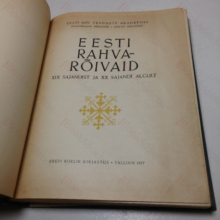 Text in Estonian. 256pp, CXXII plates (some fold-outs), two patterns loosely laid-in. Grey cloth cloth-covered boards; gilt titles on front and spine; patterned endpapers. 4to. Sun-faded spine, rubbed corners and spine ends. Text block edges tanning. Endpapers starting to tan; gutter strained, volume loose; pages tanning. Otherwise, internally neat and clean barring some annotations on contents page.