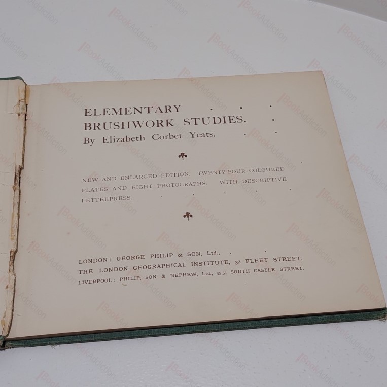 Not dated but circa 1905. A new and enlarged edition (following the first edition of 1900). ix, followed by 24 coloured plates, each with descriptive text opposite. In green cloth-covered boards with black lettering to front and spine (boards rubbed at edges, right through on corners and spine tips, spine worn, and perhaps a tad faded). Some mild spotting and mild marginal toning. Gutter cracked and loosening between front endpapers and title page. The last leaf of the book contains adverts for other publications from the publisher – it is chipped along gutter and the lower inch has been roughly removed. A scarce and sought after title, its hand-coloured plates and clear annotations its strongest attraction. Yeats, an art teacher, published several books and was the founder of Dun Emer Press, which also published several works by her brother, the Irish poet, W B Yeats. She was the first commercial printer in Ireland to work exclusively with hand presses. Landscape 4to.