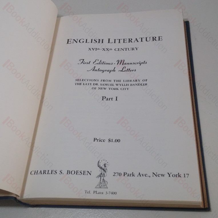 Undated but circa 1934. All four parts of the catalogue issued by notable New York rare bookseller, Charles S Boesen covering the collection of Dr Samuel Wyllis Bandler, bound into a single volume. Signed and inscribed by Charles Boesen on the front free endpaper. Runs to some 400 pages in total with some black and white plate illustrations of collection items. Bound in blue cloth-covered boards with gilt lettering and decoration on front and spine. Cloth a little rounded at spine ends, slightly faded at edges. Upper text block edge a little dust darkened. Internally neat, clean, bright and tight.