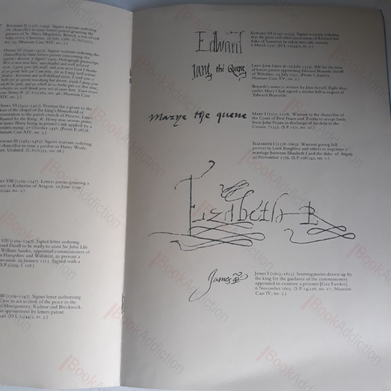 12pp. Blue card covers, stapled booklet. Very good condition throughout. There is a stamp on the reverse of the title page and a number written, small and neat, on the top edge of the front cover, else clean and crisp. Large facsimile reproductions of the signatures of English monarchs from Richard II (1377-1399) to Elizabeth II (1952-), with an introduction by R J Goulden. A large format booklet.
