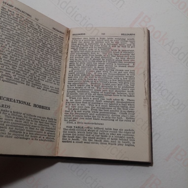 [1935]. 252pp. In cloth-covered boards, made to look like leather, with faded gilt titles (boards are lightly rubbed at spine tips, a little rounded on corners). Internally neat, clean, bright and tight barring a couple of spots on endpapers. 24mo. A compact volume packed full guides on how to get started with various hobbies, including handicrafts such as Basket Work and Painting on Glass; Mechanic hobbies such as photography; Home and Garden hobbies such as bee keeping; Collector’s hobbies such a antique collecting and recreational hobbies such as billiards, card games, chess and hand reading. A nice vintage companion to have to hand in those empty moments.
