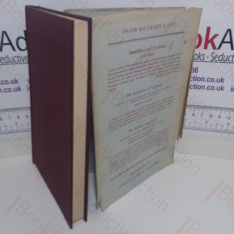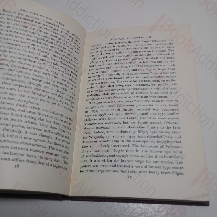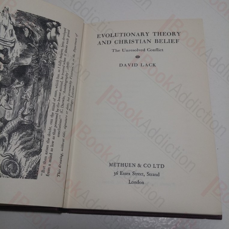 128pp, black and white frontispiece. Red cloth-covered boards with gilt titles on spine. 12mo. Sun-fading to lower part of spine cover where there is jacket loss, tail end lightly rounded. Text block edges just starting to fox. Free endpapers lightly tanned with previous owners inscription. Internally neat, clean, bright and tight. Dust jacket almost torn in two down rear joint, has heavy sun-fading to spine and edges, small tears and chipping to top edge, 4cm loss at spine heel; not price clipped. Aims not to press the claims of either Christianity or secular humanism but to assess the theory of evolution in relation to both.