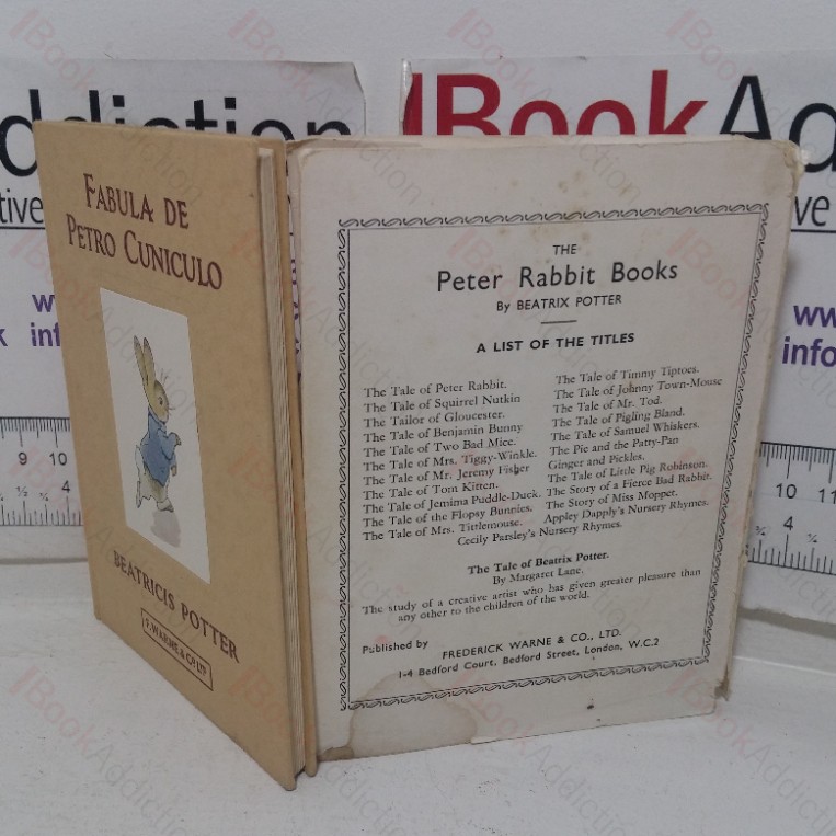 Text in Latin. 60pp, with colour illustrations throughout. In paper-covered boards with pictorial onlay (of Peter Rabbit) on the front panel. Illustrated endpapers. 16mo. Boards a little squeezed at spine ends, gently rubbed on corners. Internally fresh and tidy. In its original price clipped dust wrapper, cracked along spine folds, with a little rubbing and chipping at corners and spine tips, shelf worn and rubbed at edges.