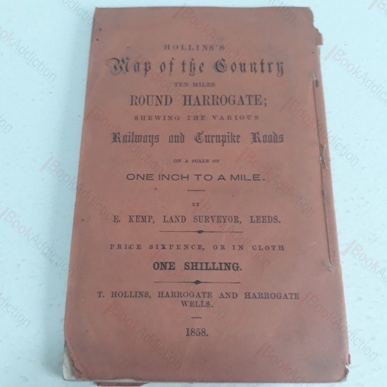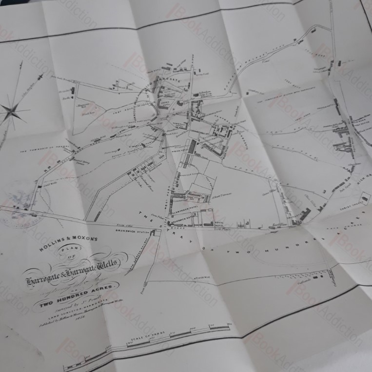 48pp booklet with printed card covers (covers worn, rubbed and chapped at edges, bumped and creased at spine ends). Internally some wear and soiling at page edges, but generally neat and tidy. Previous owner’s stamp on reverse of map. Complete with large scale fold-out plan of the town of Harrogate in 1858 (not showing any railways lines). A brief overview of the history of the town and its place as the ‘head of the British Watering Places’, together with commercial, clergy and local services directories etc, with some contemporary advertisements for local business and services. Large 12mo