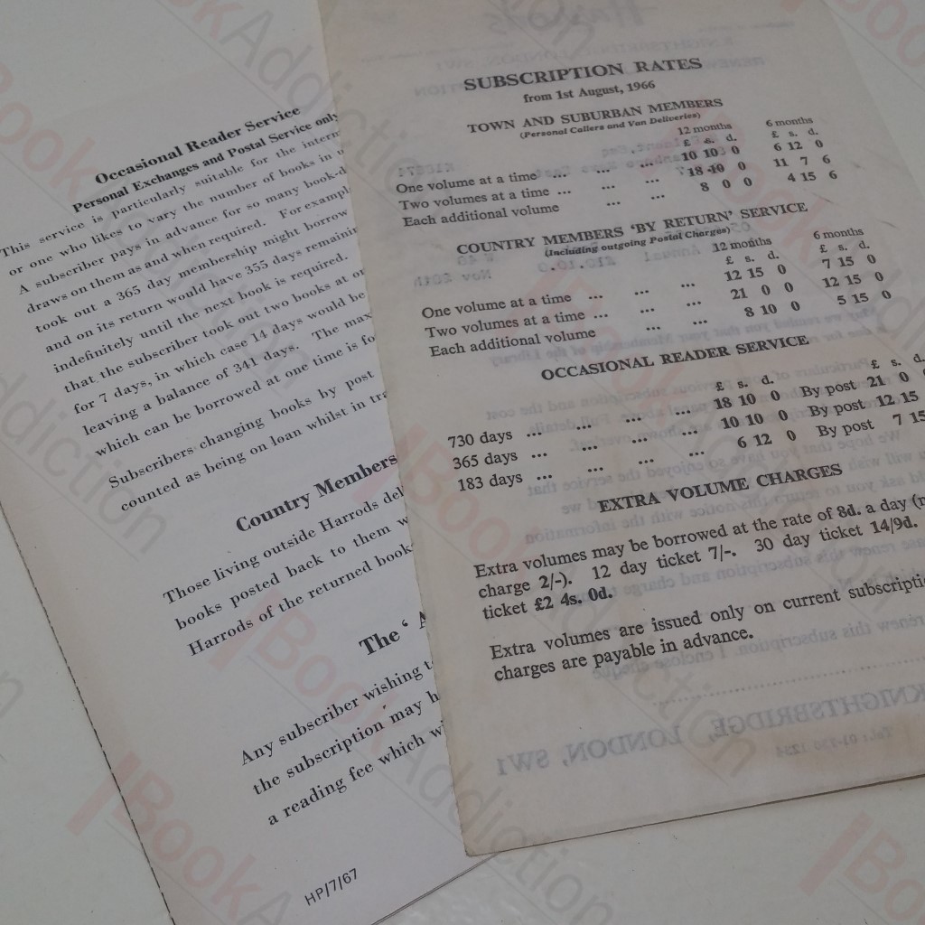 Six panelled folded leaflet describing Harrods Library Service, its terms of service and the subscription rates for 1970 for the various levels of membership available. The leaflet has been stored folded, so has some creasing across the centre and is a little worn; the last panel is partially detached, where there is a crack running halfway along the fold; clean and bright. Approximately 40 by 18.5 cm when fully opened. Together with a Subscription Renewal Form, completed for one M Belmont – a roughly A5 slip, printed on both sides, a little browned, with a particulars of previous subscription pasted onto the lower half. Harrods, the upmarket department store in London’s Knightsbridge, ran a subscription library service (together with a second hand book shop) from 1908 until 1989. Rare survivals from a time gone by, and a marker in Harrods’ and retail history.