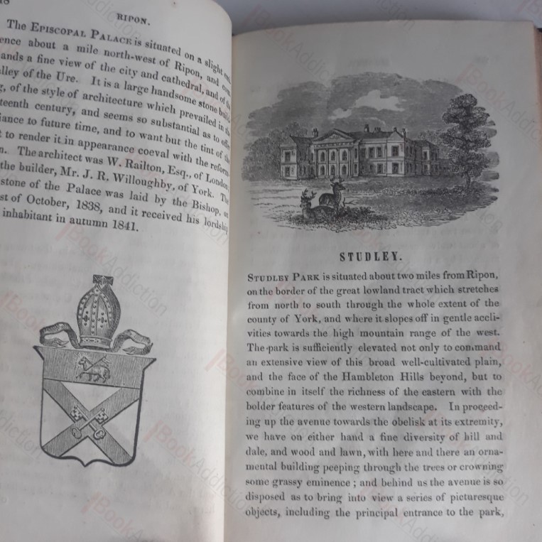 8th edition. 98pp. Three-quarter bound in leather over marbled card boards (boards rubbed at edges with a few small scuffs on surface, rounded at corners and indentation on upper edge on rear). Illustrated with wood engravings and complete with linen gate-folded map of the Harrogate area at front. The map is a little discoloured and creased, their is a previous owner’s name in a copperplate hand on the front paste down endpaper, a few small marks, especially on rear endpapers and occasional mild toning, else internally neat and clean. A few small cracks on edge of title page. Binding remains tight and firm. A charming and evocative volume, detailing the scenes and sites for visitors to Harrogate – Ripon and its Cathedral, Fountains Abbey, Harewood House, Bolton Abbey,Masham, Ripley, Plumpton etc, with a section at end on the Harrogate spa and waters by a local surgeon, Alfred Smith. Local adverts, some colour printed.