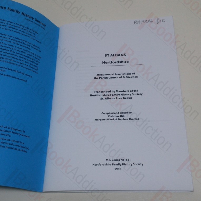 Reprint. 64pp stapled booklet, with plans and line drawings in text, in stiff card covers. 8vo. Neat, clean, bright and tight throughout, with just very gentle edge wear to card covers. Transcriptions of the memorials etc in the Parish Church of St Stephen in St Albans, aimed to assist those researching their genealogy or family history.