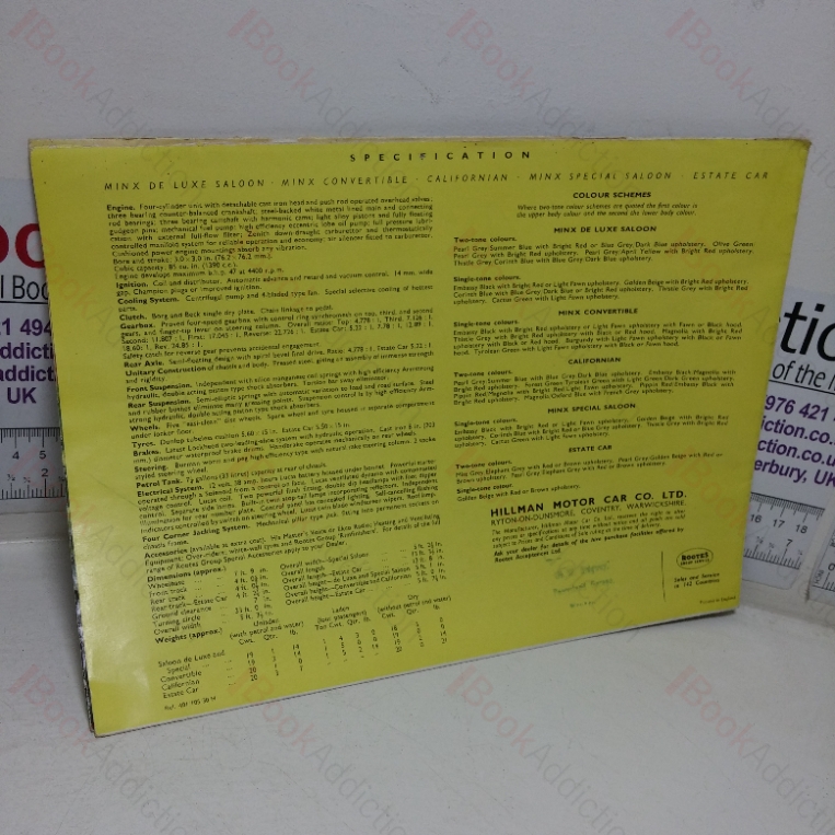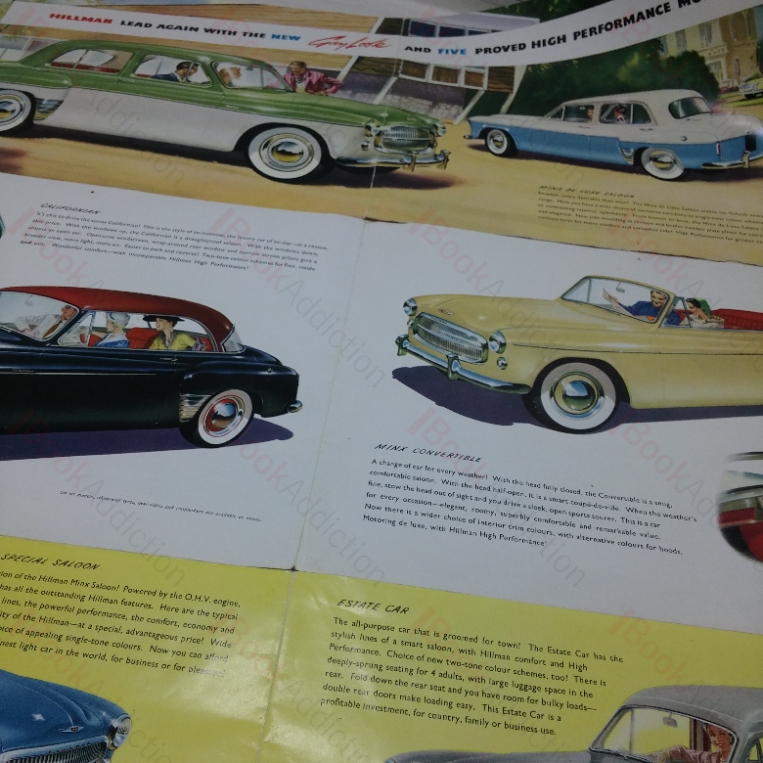 Undated but circa mid 1950s.  A six-panelled folded sales brochure on glossy paper, with stunning coloured illustrations of the various Hillman Minx models and variants (with specifications) in the mid 1950s.  The exposed parts of the brochure are rubbed at edges and showing some indentations and mild creases, several tears along folds (not affecting images), worn with a few small chips. and slight waviness towards edges.