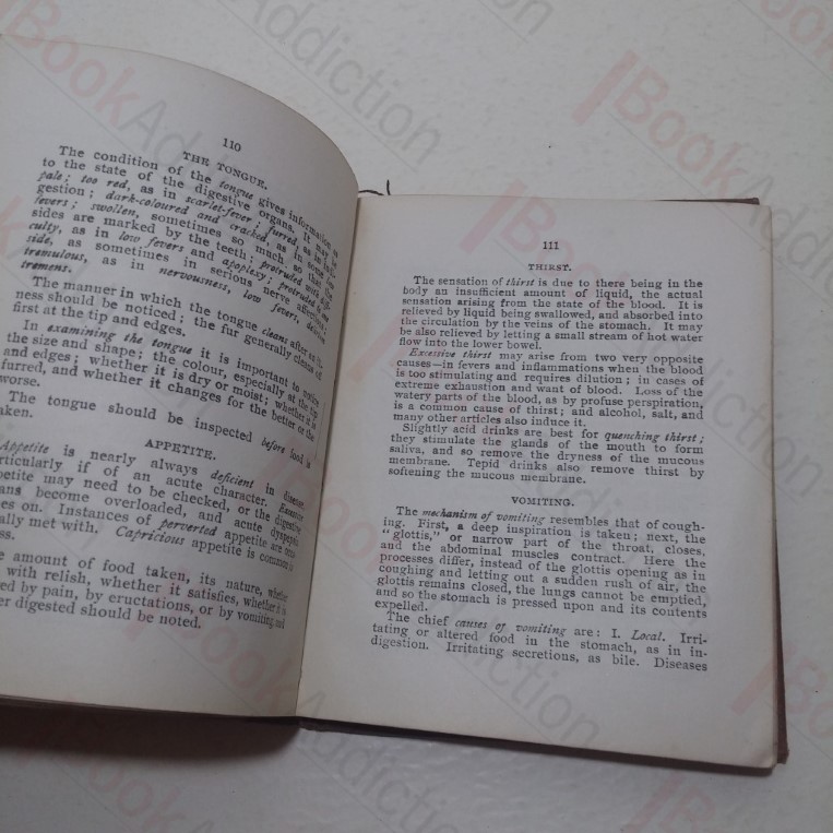 178pp, plus 14pp catalogue at rear. In cloth covered boards, with the emblem of St John’s Ambulance Association on the front panel, white lettering (faded) on spine. Brown endpapers. Boards heavily rubbed at edges, with a few marks on cloth. Loosening with webbing visible in places. Early pages dog eared. Previous owner’s name on endpapers, and again of verso. A little underlining, and some pencil manuscript notes on the last blank page. A compact volume of guidance for all who have to nurse the sick, arranged in conformity with the St John’s Ambulance Home Nursing course, 1920s style. 24mo.