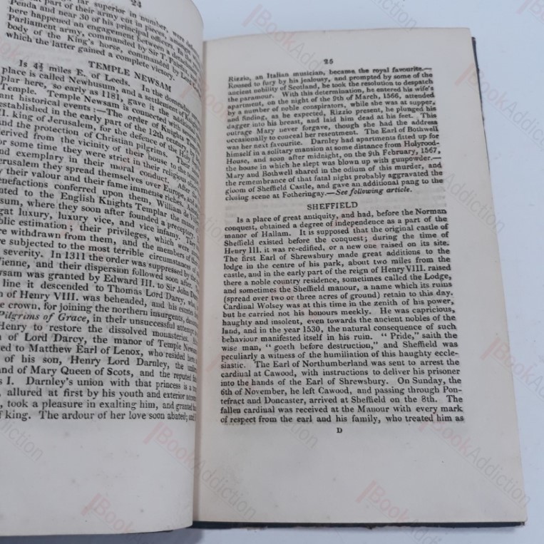 No author or publisher details. 124pp. Brown half-leather over marbled boards with gilt lettering and decoration on spine. Worn through at top of spine heel, general wear all over, leather scuffed. Initials on rear free end paper. Slight foxing on prelims. Otherwise excellent, clean, clear and tight. 12mo. Brief histories & descriptions of some two hundred settlements in Yorkshire including Wakefield, Fountains Abbey, Watton, Welton, Kilnsea, Danes Dale, Bardsey, Arncliffe, Addle, Swinton, Wensley, Malton etc
