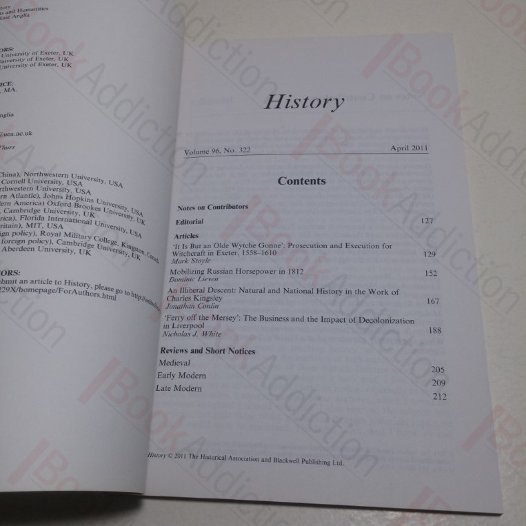 Contents: ‘It is but an olde wytche gonne’: Prosecution and Execution for Witchcraft in Exeter , 1558-1610; Mobilizing Russian Horsepower in 1812; An Illiberal Descent: Natural and National History in the Work of Charles Kingsley; Ferry off the Mersey: The Business and the Impact of Decolonization in Liverpool.