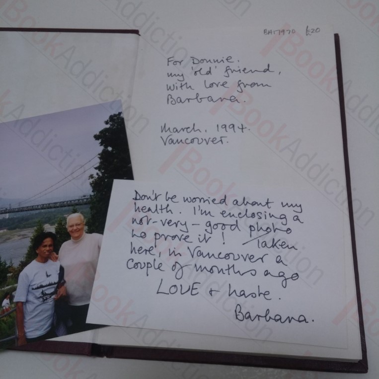 First edition, first printing. x, 216pp, with occasional line drawings in text. In brown cloth-covered boards with beige titles front and spine. Signed and inscribed by the author on the front free endpaper, ‘For Donnie, my ‘old friend’, with love from Barbara, March 1994, Vancouver’. A handwritten note from the author, regarding her health, on a plain postcard and a photo of the author loosely laid in. 8vo. Boards very slightly bruised at spine ends, else neat, clean, bright and tight throughout. In its original dust jacket, lightly rubbed at edges, sunned over spine, torn on verso with significant central loss.