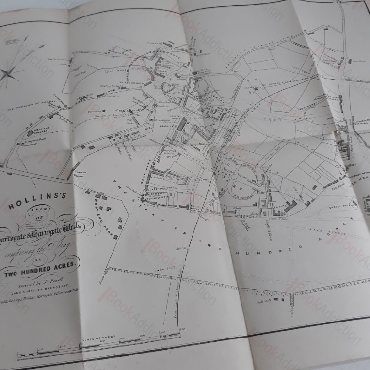 Not dated but internal evidence suggests 1860s. Map folding out to 18 x 15 inches, showing Harrogate and its surroundings as they were in around 1865. Large scale, one inch to a mile. In printed paper cover (cover is worn, soiled and chapped at edges). Previous owner’s stamp inside front cover. The map itself is crisp and clean but has some short cracks along folds and some minor loss at edge (not affecting image). Shows the old Church Fenton line into Harrogate, with the new ‘central’ station which was opened in 1862. Large 12mo as folded.