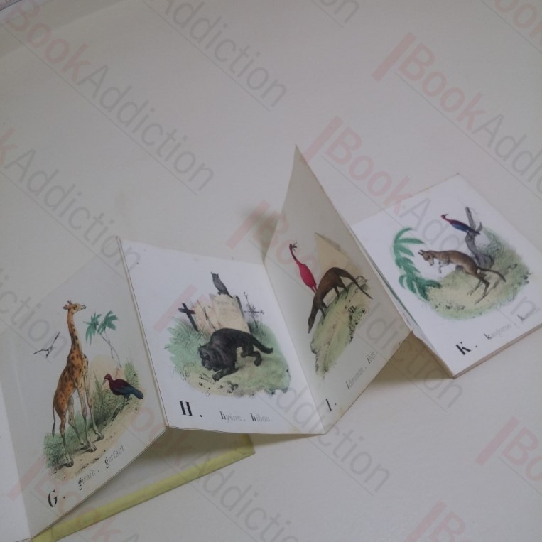 Undated, circa 1854??. A delightful, concertina alphabet book, with A on the front covers, a page a piece for all other letters, with sparkling, hand coloured lithographs of exotic animals to illustrate each letter. In embossed cloth-covered boards. 24mo. Boards worn, lightly rubbed on corners and spine ends, and a little spotted, with a little soiling. Internally some occasional spotting and a little warping, and the last page as a rust mark, but generally neat, clean and bright. There’s an inscription on the rear paste down, dated 1854.