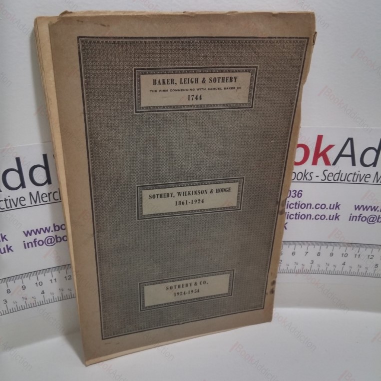 20pp, five black and white plates. Printed light card covers, stapled through. Cover detaching from top staple, chipping to edges. Staples corroding staining pages. Prelim pages tanning. Internally neat, clean and tight. 12mo. Catalogue of the sale held on Thursday 8th April 1954. The property of The Most Hon. the Marquess of Anglesey; The Property of the Rt. Hon Lord Derwent; The Property of P. E.C. Boissier Esq; The Property of C.J. Carroll Esq and The Property of a Gentleman (decd). 136 lots.