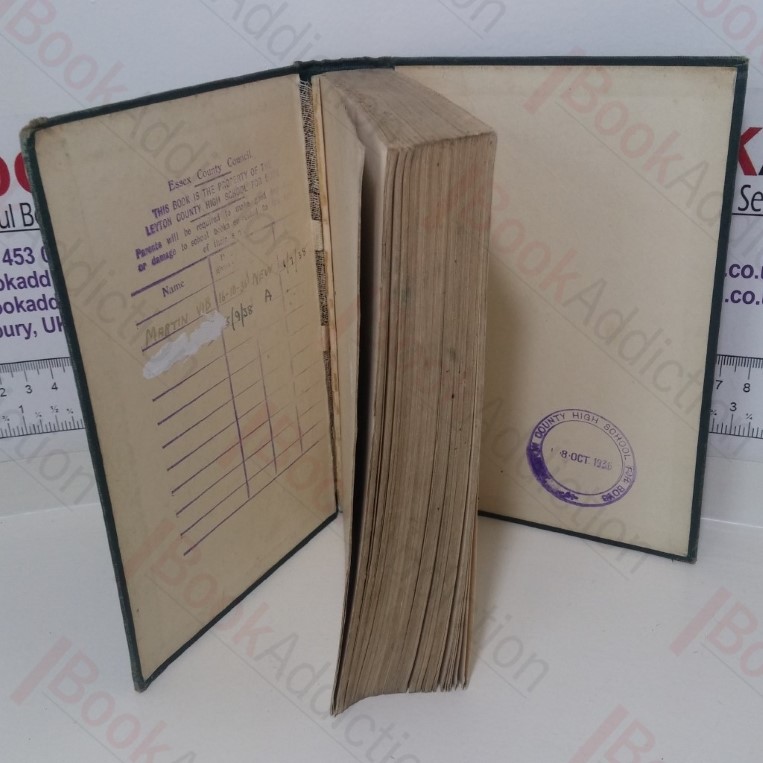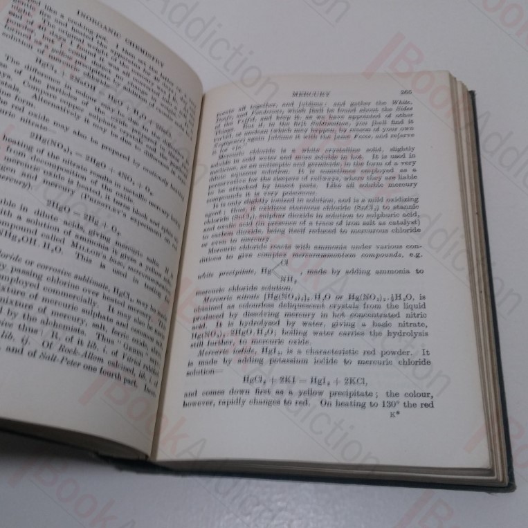 xii, 576pp. Dark green cloth-covered boards; black title on front and spine, some black and white photographs (inc. frontispiece) and many diagrams. 12mo. Wear to boards, stain top front at joint. Spine worn, ends rubbed with some splits in cloth, small <1cm loss in cloth on front spine joint. Edges worn, corners rubbed and rounded with cloth worn through. Text block edges tanned and lightly soiled, top edge dusty. Block dropped, volume cocked and loose. Endpapers tanned, lending sheet stamped on front pastedown and stamp on rear pastedown. Hinges stretched. Light soiling on endpapers and prelims. Textbook for inorganic chemistry.