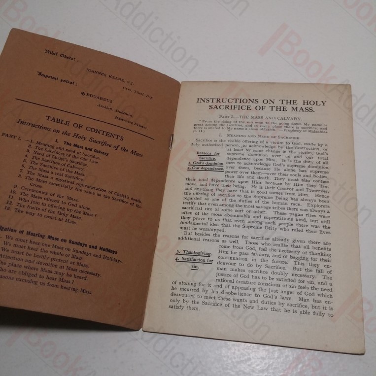 16pp. Printed heavy paper covers, stapled. Chipping to edges and wear to covers. Internally, neat, clean, bright and tight, barring occasional spotting. 12mo. Part l covers The Mass and Calvary & Part ll The Obligation of Hearing Mass on Sundays and Holidays.