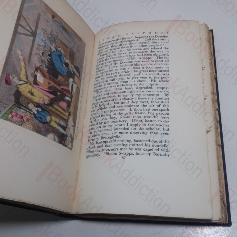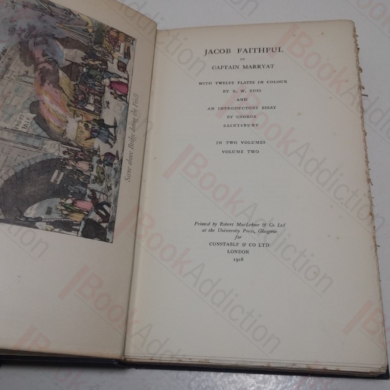 Complete in two volumes. Vol 1: ixl, 276pp, five colour plates (inc. frontispiece). Vol 2: 320pp, seven colour plates (inc. frontispiece). Colour plates by R W Buss. Unnumbered Limited Edition of 750 copies. Navy blue cloth-covered boards; blind embossed design on boards, gilt titles on spine. 8vo. Both volumes in similar condition: bumped spine ends, cloth wearing. Top text block edge gilt, remaining edges untrimmed. Gift inscription on front free endpaper of volume 1. Mild foxing throughout, worse on prelims. Internally neat, clean, bright and tight. Historical novel of Jacob Faithful who lost his parents in dramatic circumstances and was brought up on the lighters on the River Thames by the owner of the wharf. Volume I includes an introductory essay by George Saintsbury.