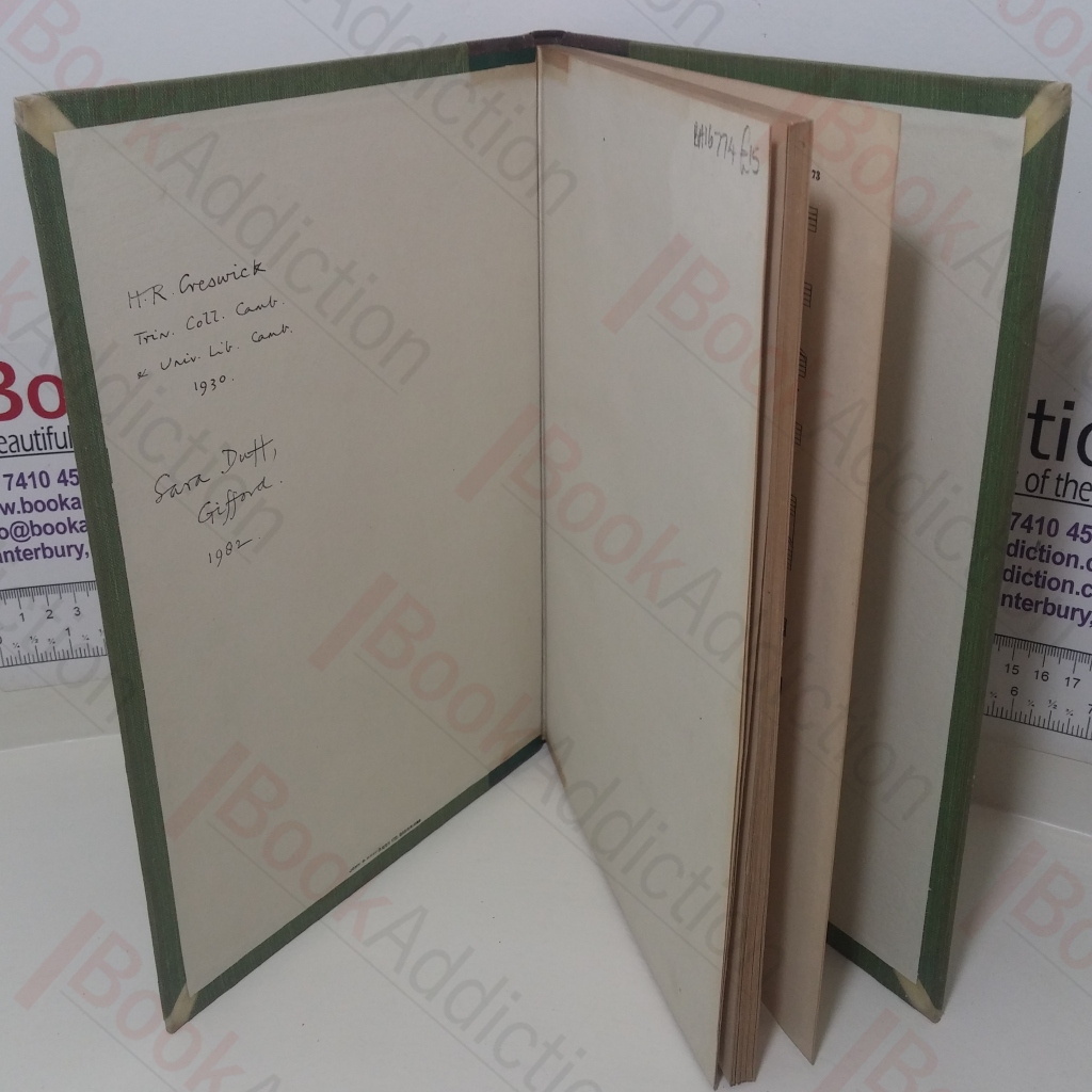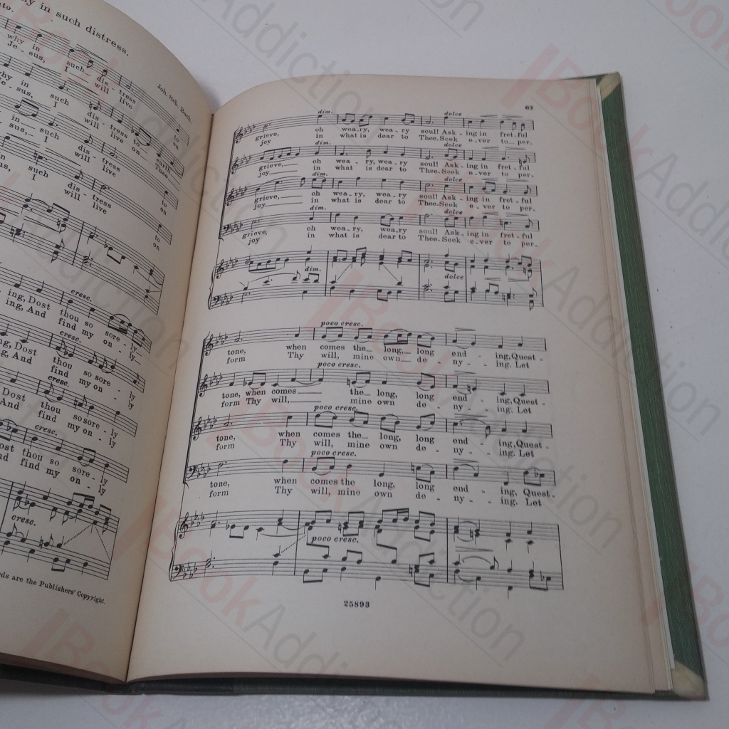 Not dated but circa 1920. 74pp, with lyrics and musical scores. Quarter-bound in green leather over paler green cloth-covered boards. 4to. Boards a little rubbed on corners, sunned and scuffed around spine. Front hinge partially cracked, but still robustly bound), two previous owner’s names on front free endpaper, one dated 1930, the other dated 1982. Short, thin strip of browning on endpapers, discreet stamp on title page, else internally neat, clean and tight. Twenty-six Bach part songs with music and lyrics.
