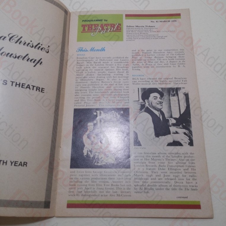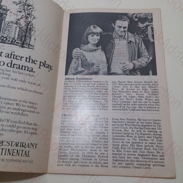 16pp. Printed paper covers, stapled. Page margins tanning. Internally neat, clean, bright and tight. 8vo. Theatre programme for the show starring Alison Steadman, Christopher Cazenove, Julian Fellowes, John Price, Diane Bull, Jennifer Piercey, Marcia Warren and Robert Austin. Illustrated with black and white photographs and period advertisements.
